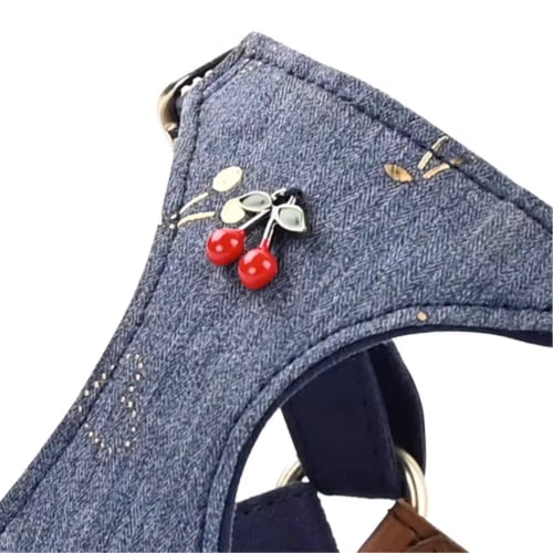 お散歩の準備を「もっと楽しく、もっと手軽に!」 さくらんぼのチャームがワンポイントの、デニム風おしゃれハーネスです。