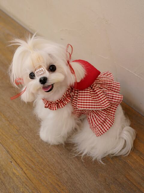 犬服 ハート ギンガムチェック フリルワンピース 背中ぷっくりハート 華やか ガーリー お出かけ