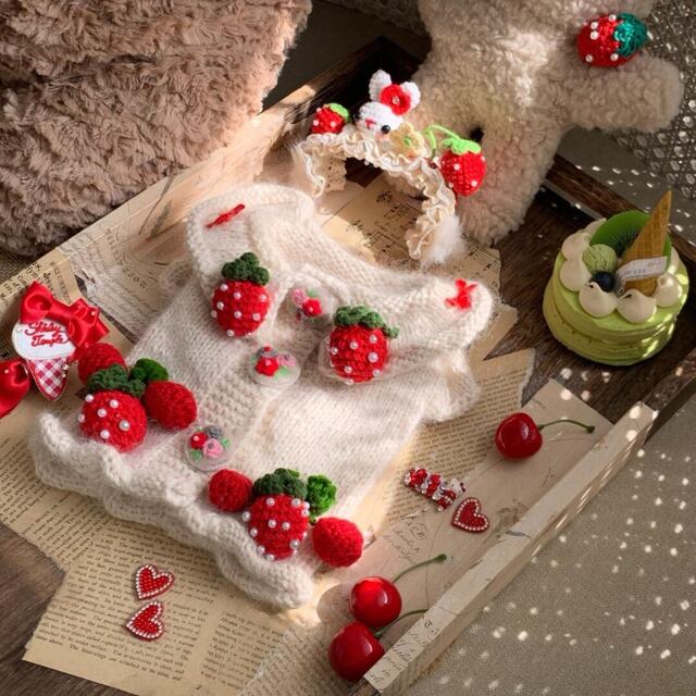 犬服 ドッグウェア いちごモチーフ ニットベスト ハンドメイド風 暖か モコモコ お出かけ