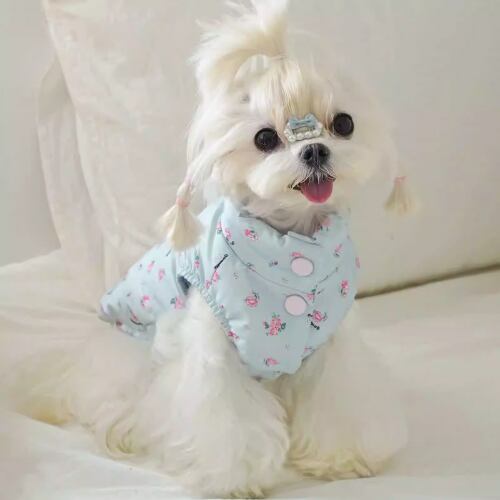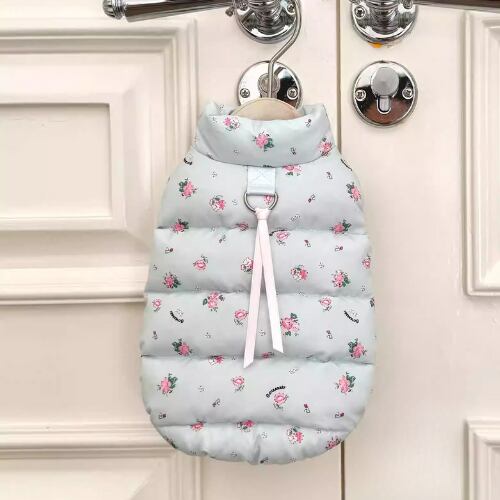 高品質なホワイトダックダウンを90%使用した、爽やかなライトブルーの小花柄ダウンベストです。 冬の寒さからワンちゃんをしっかり守りつつ、上品なおしゃれを楽しめる一着です。