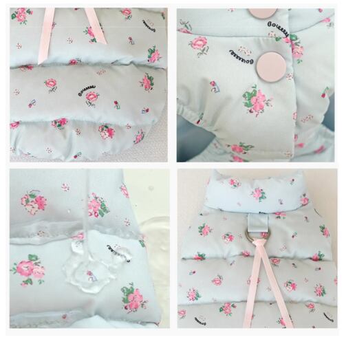 犬服 ホワイトダックダウン使用 小花柄 ベスト 水色 ベビーブルー 撥水 Dカン付き 軽量 暖か 上品