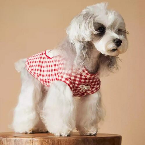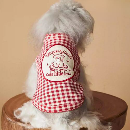犬服 ギンガムチェック タンクトップ クマ ワッペン 赤 チェック ガーリー メロウ裾