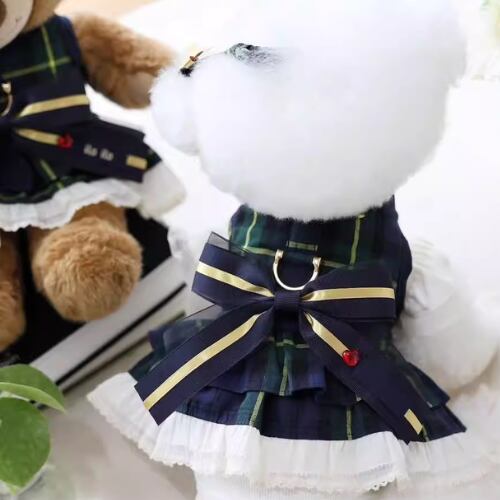 犬服 トラッド風 ケーブルニット ワンピース チェック柄 ビッグリボン フリル 上品